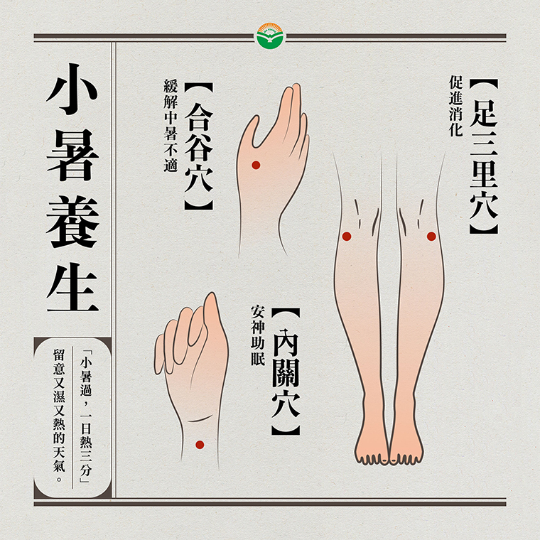 中醫師陳佳伶表示,小暑對應人體的「心」與「脾」,因為夏天的陽氣旺盛,心火容易亢盛,再加上濕氣重亦會影響脾胃功能,時常使人出現疲倦、食慾不振、煩躁等問題,因此養生重點在於「清熱解暑、 健脾祛濕、養心安神」。