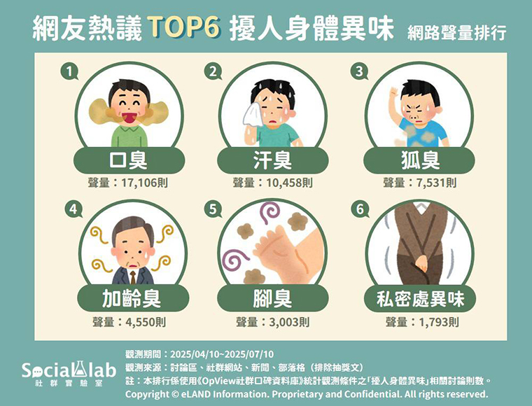 【NOW健康 陳如頤/台北報導】在辦公室、電梯或密閉空間,不明異味常令人皺眉,尤其夏天更甚。若不慎成為異味來源,不僅尷尬,更可能影響人際互動與自信心。《Social Lab社群實驗室》本次透過《OpView社群口碑資料庫》追蹤近3個月「擾人身體異味」相關話題的網路聲量,帶您了解網友熱議的6大擾人身體異味有哪些。