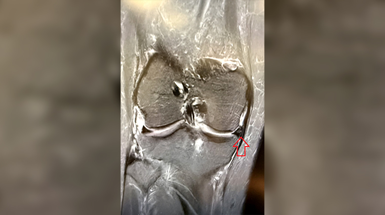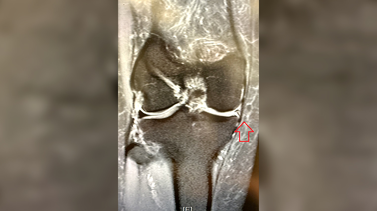 ▲手術前,核磁造影檢查發現半月軟骨不見蹤跡。(圖/台北慈濟醫院提供)