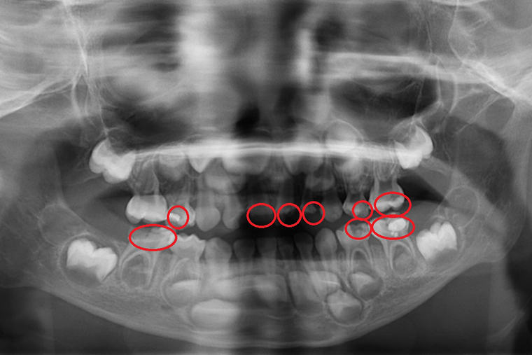 ▲X光看見孩子多顆蛀牙(紅圈處均是蛀牙處)。(圖/台北慈濟醫院提供)