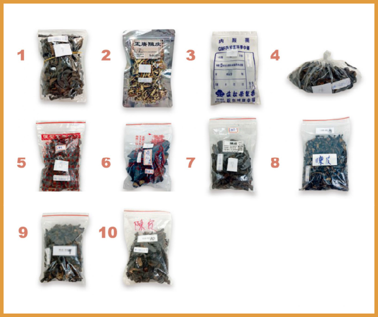陳皮並非新鮮的橘子皮曝曬乾燥,依據《本草備要》記載,放置3年以上的柑橘皮才能稱作「陳皮」,柑橘皮顏色會隨著每年晾曬而轉黑,且放愈久,香味愈濃、藥用效果愈好,通常陳皮要經炮製、乾燥、陳化,讓其中的揮發油成分散失後才能使用。經鑑別,10件樣品皆為陳皮。
