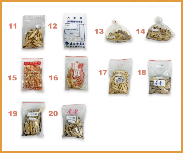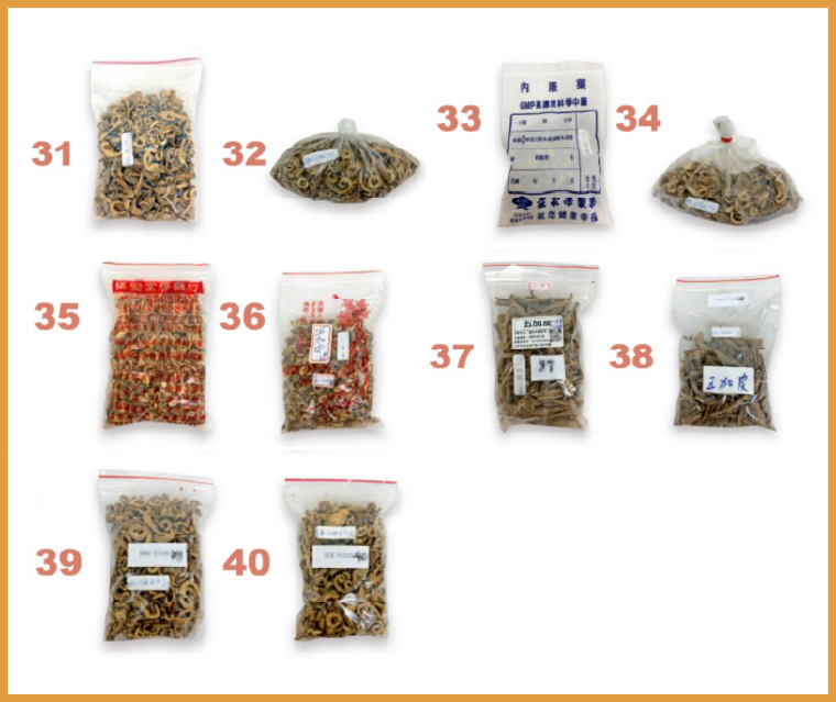 2025年3月中下旬至4月初於台北市、新北市、台中市及高雄市的中藥行或蔘藥行等地,告知店家購買陳皮、黃耆、苦杏仁及五加皮等4種中藥材,每種藥材購買10件,共計購得40件。40件樣品中僅有2件為包裝樣品,且標示來自中國大陸,其餘皆為散裝樣品。