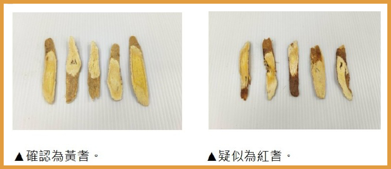 消費者到中藥行購買黃耆時,有時會發現包裝上寫的是「紅耆(晉耆)」,紅耆的根皮為紅色,切面皮部為紅棕色,肉質中心偏黃色。紅耆為豆科植物多序岩黃耆Hedysarum polybotrys Hand.-Mazz.之乾燥根,雖也具有補氣的功效,但效果不如黃耆佳,味道除了較黃耆甜外,也沒有豆腥味,咀嚼後纖維較黃耆多,因此多用於藥膳或食補中。經檢測結果發現,3件為黃耆,其餘7件疑似為紅耆。
