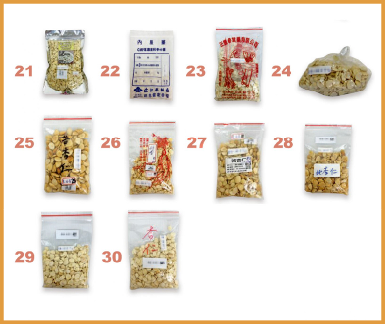 此外,苦杏仁外觀呈米黃色的扁心臟狀,頂端略尖,基部鈍圓,左右不對稱。甜杏仁體型較苦杏仁大些、細長且左右對稱,香氣淡而雅緻,這兩者和市面上堅果類「杏仁」並不相同,因為堅果的「杏仁」其實是「扁桃仁」。經鑑別,10件樣品皆為苦杏仁。