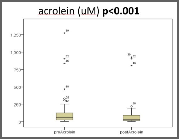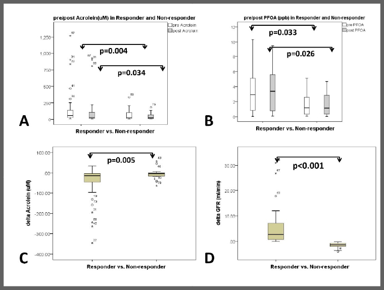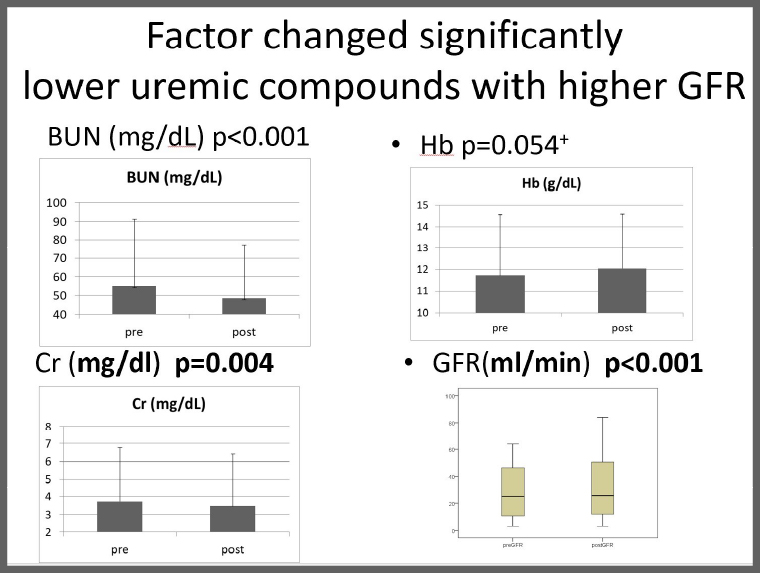 值得注意的是,整體81人的血紅素(Hb)也有些微提升,顯示血液狀況改善。此外,血清中丙烯醛的含量在治療後在腎功能改善的63人顯著降低(p<0.001),從測試前的136降至98(單位為μM,十的負六次方莫爾濃度),而腎功能未顯著改善的患者(18人)也有一定的下降,從48降到42。尤其是在腎功能改善的患者中,丙烯醛的改善兩組相比更為明顯(p=0.005),這證明該口服活性碳能有效吸附體內有害的丙烯醛,進而改善腎臟功能。