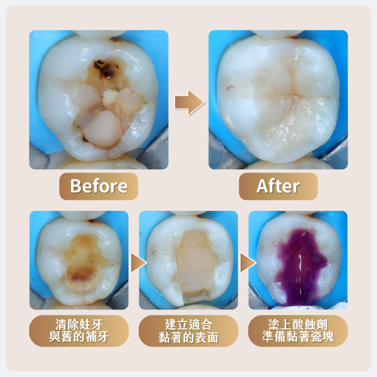 以二次蛀牙為例,因為蛀洞比第一次更大更深,牙齒結構是脆弱的,若再用樹脂修補,也容易失效;瓷塊則能更有效恢復功能並保留原生牙齒。