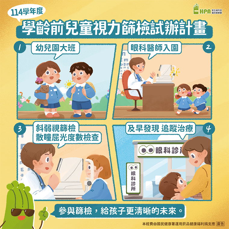 國健署並提醒家長關注、掌握孩子視力健康的黃金年齡,認知散瞳篩檢的必要性,也提醒家長若有接到幼兒園提供之視力篩檢說明及通知,請配合讓孩子接受篩檢,以及早掌握孩子近視或遠視儲備真實情況,早期發現問題與及早治療,才能為孩子的未來視界打下健康基礎。