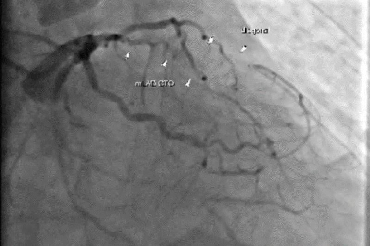 ▲個案在心導管檢查中,發現3條冠狀動脈全數堵塞,病況危急。(圖/台北慈濟醫院提供)