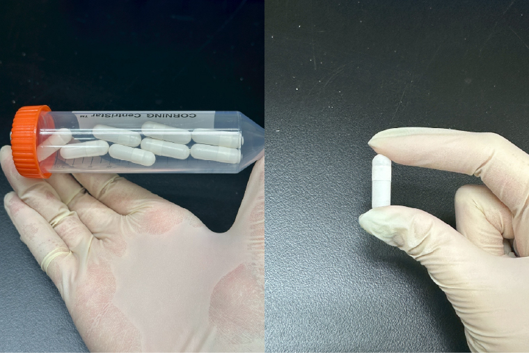 ▲林口微菌治療中心發展微菌叢膠囊,使用腸溶性不透明膠囊包裹凍乾微菌叢,一次療程共8顆膠囊。(圖/長庚醫院提供)